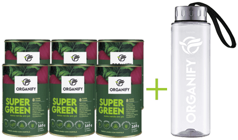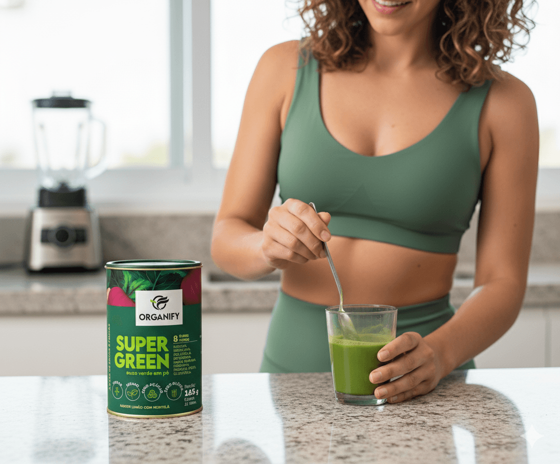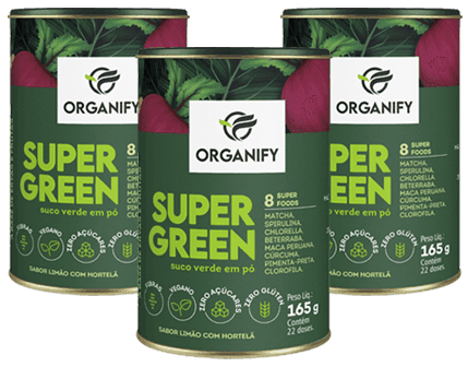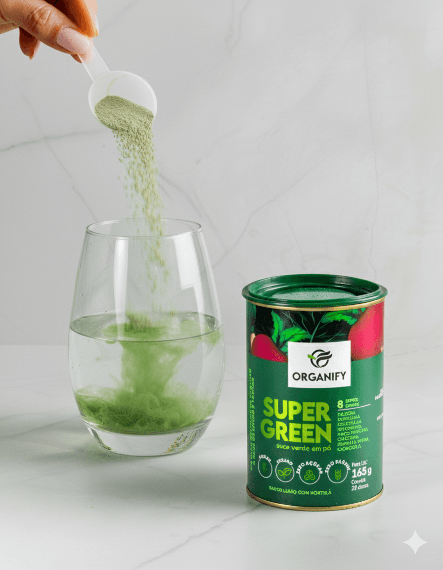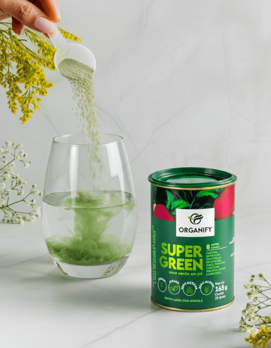 "O Super Green da Organify é um suco verde em pó feito com oito superalimentos poderosos, como spirulina, clorela e maca peruana. Sem conservantes, ele é ideal para tomar em jejum — basta misturar um scoop com água gelada e você tem um suco verde real, cheio de benefícios para o corpo e energia para o dia."